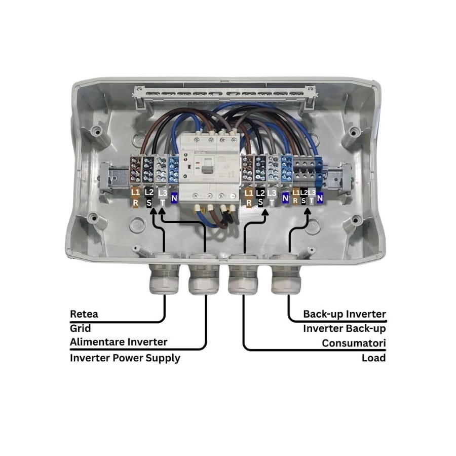 În cazul întreruperii sursei principale, sistemul comută automat pe sursa secundară, asigurând continuitatea alimentării consumatorilor trifazați.