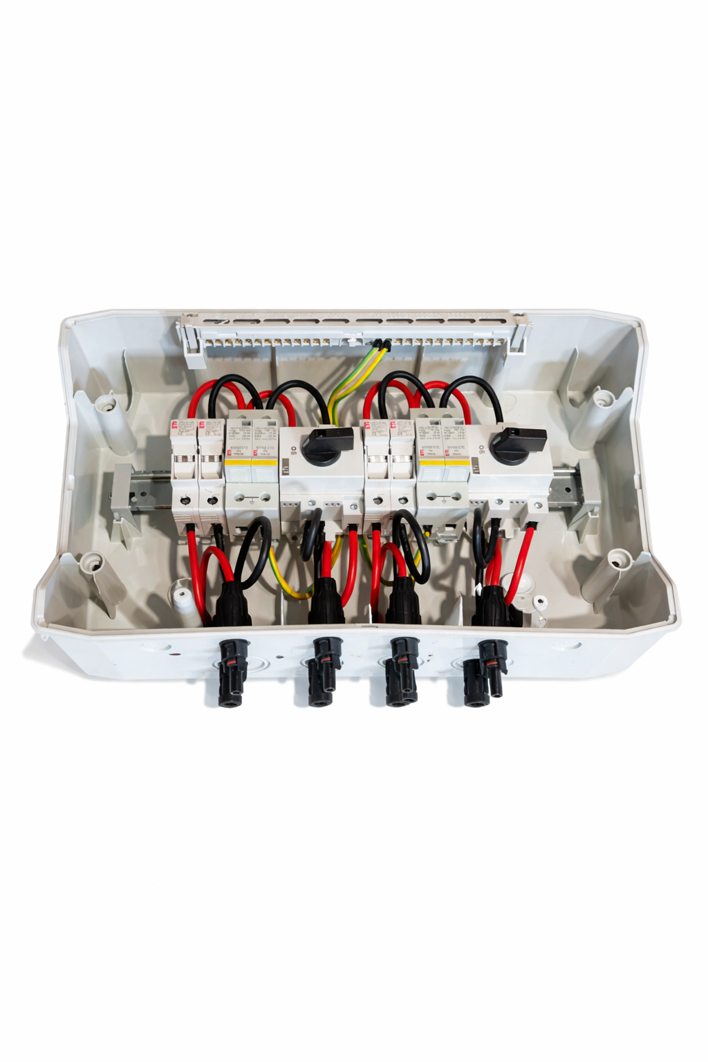 Produs asamblat profesional, cablat intern cu conductori 6mm², destinat montajului exterior (IP66), conform cerințelor uzuale pentru protecția invertorului și a circuitelor DC.